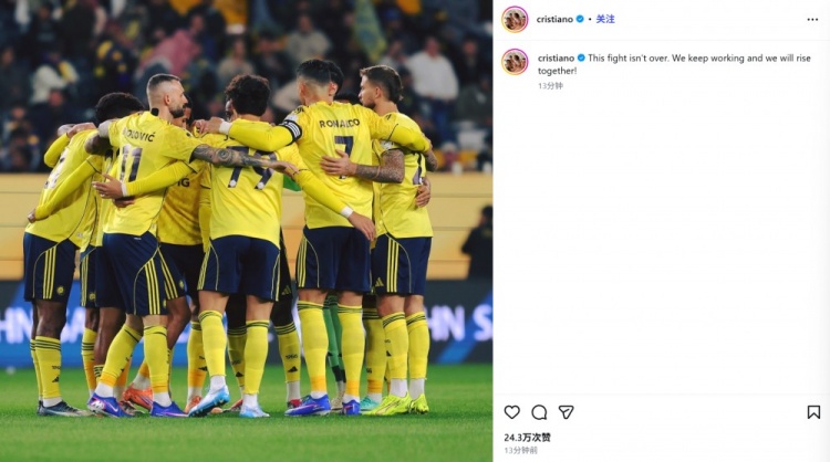 C罗也在赛后通过社媒晒出全队合照,并配文:“这场战斗还没有结束。我们继续努力,我们终将共同崛起!”