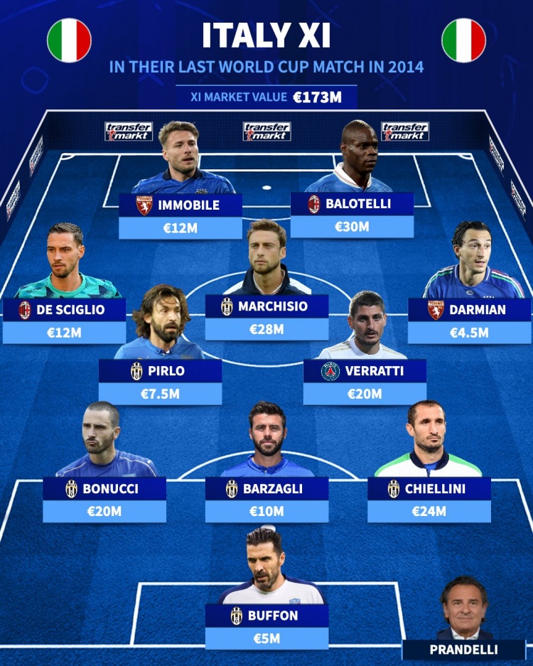 12年过去了!意大利最后一场世界杯首发:后防BBC 巴神皮尔洛出场