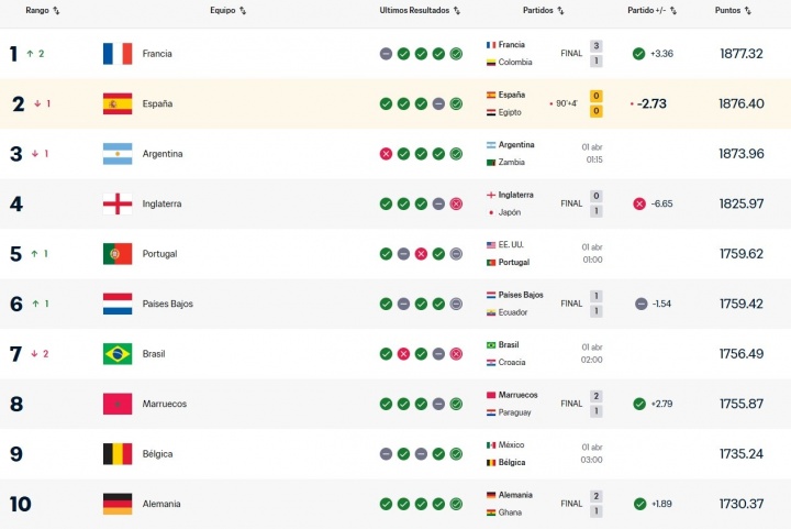 FIFA国家队即时世界排名更新,西班牙0-0战平埃及,法国即时排名反超西班牙,升至世界第1位。